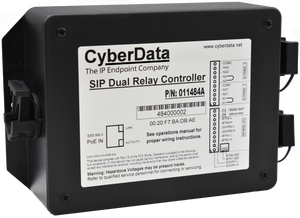 As part of a network-managed IP security infrastructure, the CyberData SIP Dual Relay Controller is a PoE-powered IP device which controls two high amperage relays to manage the unlocking and locking of doors, or activation and deactivation of a device.