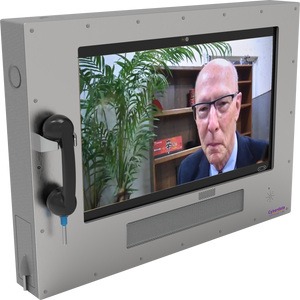 It is available with a heavy-duty handset and 32-inch armored cable or as a handsfree device utilizing the speaker and microphones of the Webex Desk Pro. The Lexan panel can be field replaced if damaged. The screws holding the stainless steel front panel are security Torx type.